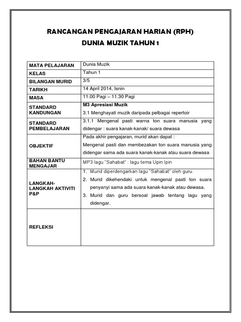 Rph Ts25 Pendidikan Muzik Tahun 1 Pendidikan Muzik Tahun 1